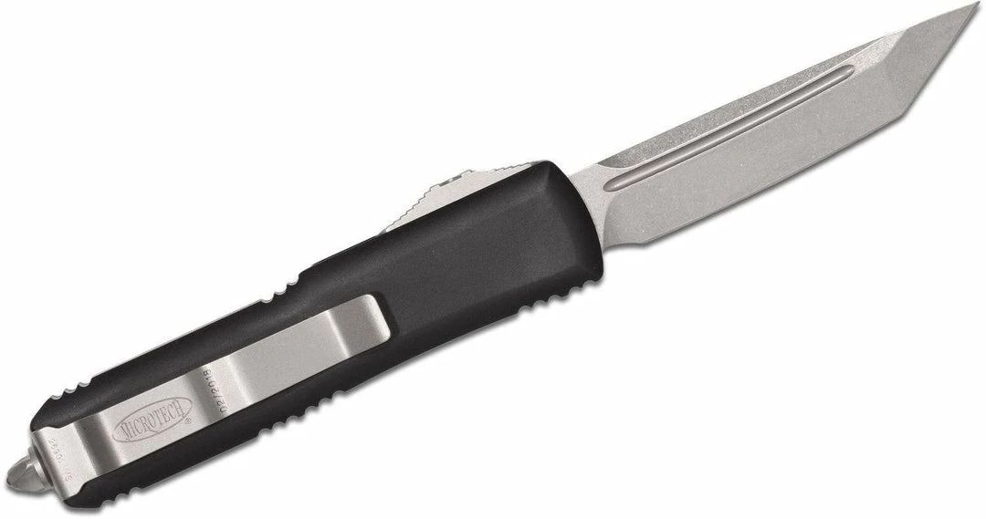Microtech UTX-85 AUTO OTF 3″ Stonewashed Tanto Plain Blade, Black Aluminum Handles (Modelย 233-10)