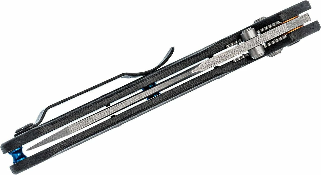 - Carbon fiber handle scales with stainless steel liners and anodized aluminum barrel spacers