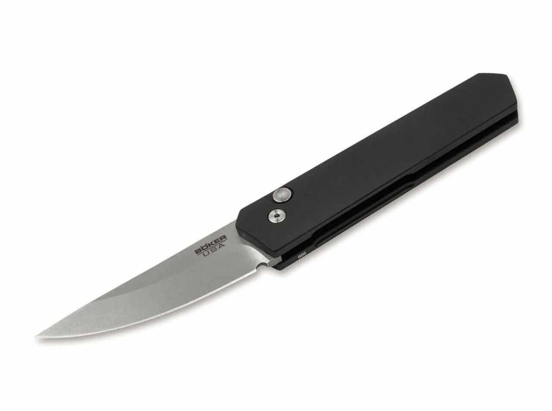 The Kwaiken Compact Auto is a slightly sturdier version, a little shorter overall but with almost the same size handle, which makes it look a touch more robust. The model retains every bit of the clean and elegant character of the Kwaiken. So, the Boker Plus Kwaiken Compact Auto is a wonderful addition to the successful series, a favorite with collectors as well as users and fans of elegant pocketknives. With a black anodizedย aluminumย handle and aย 154CMย blade with aย stonewashย finish. With aย clipย (tip-up/r).