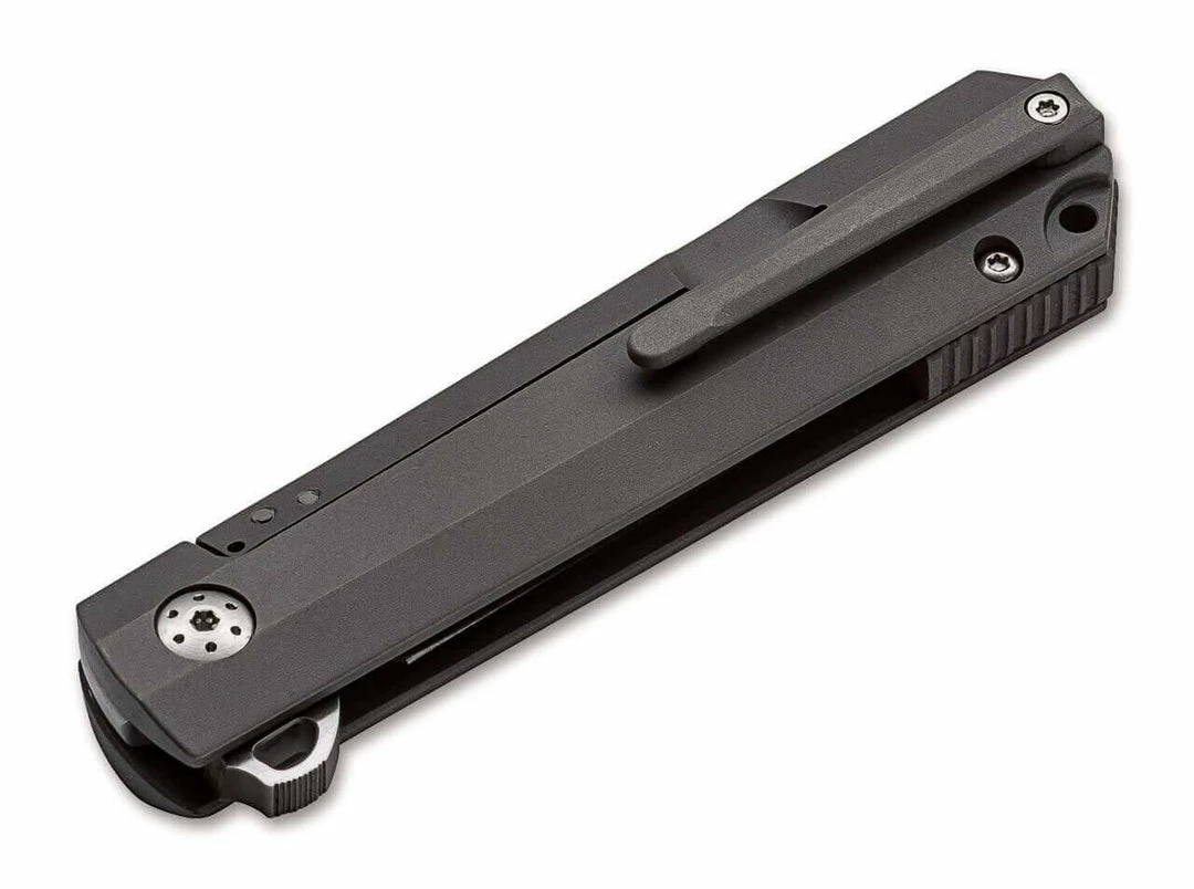 As a combination of a modern EDC and a high-quality gentleman’s knife, the Boker Plus Cataclyst convinces all along the line. The stable blade made of satin-finished D2 is opened by a ball bearing flipper and is provided with a flat grind and a double-sided groove. It is reliably locked by a reinforced Framelock. Jimpings in the area of the thumb rest and on the spacer further increase work safety. The straight-lined design is equipped with handle scales made of high-strength titanium, which are milled three-dimensionally and have weight-reducing recesses on the inside. The robust handle and deep-carry clip (tip-up/r), also milled from solid three-dimensionally, are finished with a matte beadblast finish. With lanyard hole and a high-quality nylon pouch for storage.