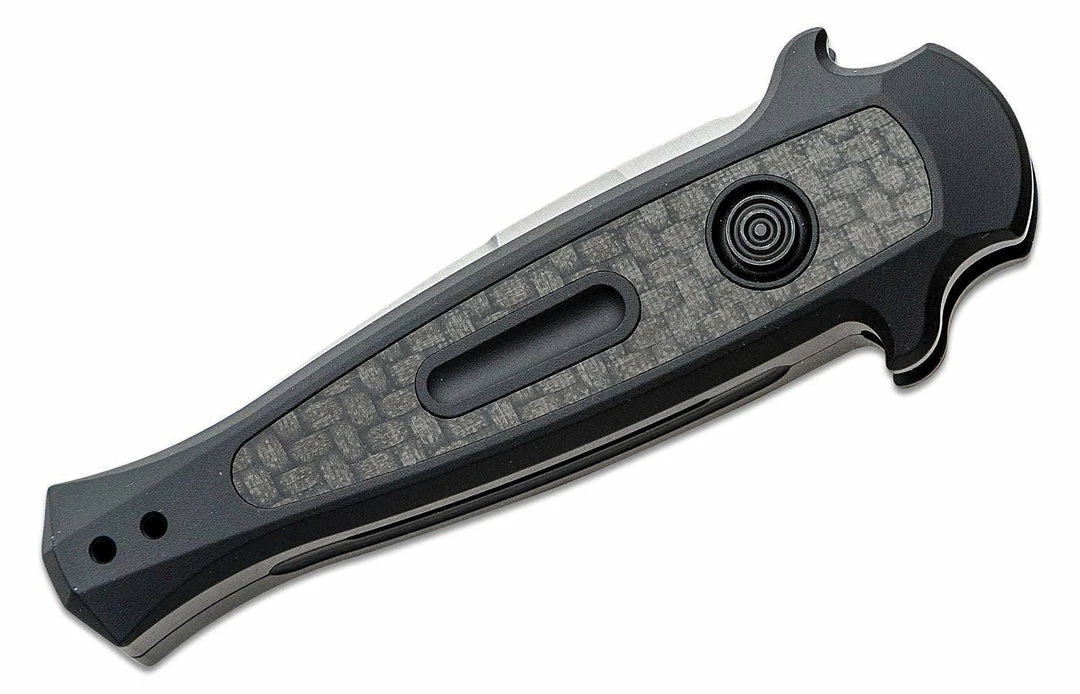 This made in the USA automatic knife has stiletto styling in a smaller package. The CPM-154 powdered metallurgy blade steel takes and holds an excellent edge, provides corrosion resistance, wear resistance, and toughness. The lightweight, strong anodized aluminum handle is comfortably slim with a carbon fiber insert, while the low-profile push button makes it harder for the blade to accidentally deploy.