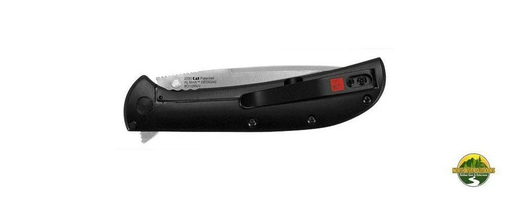 The AM-4 features SpeedSafe assisted opening for quick and simple one-handed opening. Just pull back on the flipper or push on the thumbstud. The blade is quality 8Cr13MoV stainless steel with a handsome satin finish and a top swedge. The front handle scale is G-10โcrowned and polished for a smooth feel and classy look. The back is pure steel with a sturdy frame lock to keep the blade in position until you release it. The AM-4 also features a deep-carry pocketclip with AL MARโข KNIVEs’ red logo emblem andโfor an extra measure of visual interestโwe used red standoffs.