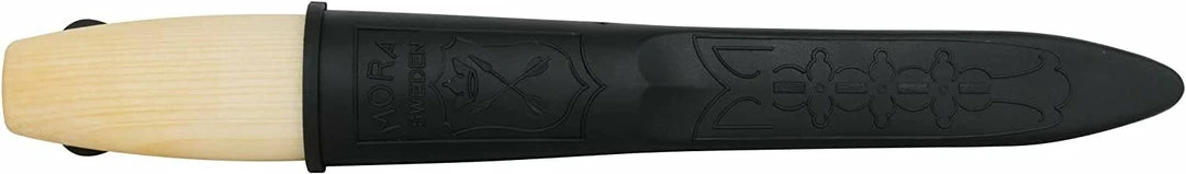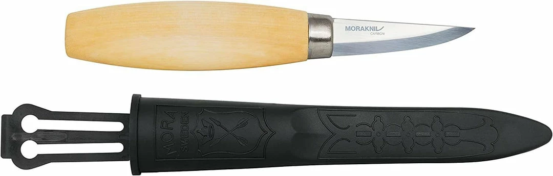 Here is a new version of Mora’s very popular 120 wood carving knife.ย This is a very faithful representation of a traditional Scandinavian carving knife, with a medium-length, narrow blade paired with a large handle for maximum grip and control.ย The blade is 100% carbon steel, hardened to Rockwell 58-59, which makes it less likely to chip and a little easier to sharpen than Mora’s original laminated blade.ย Comes with a plastic sheath.