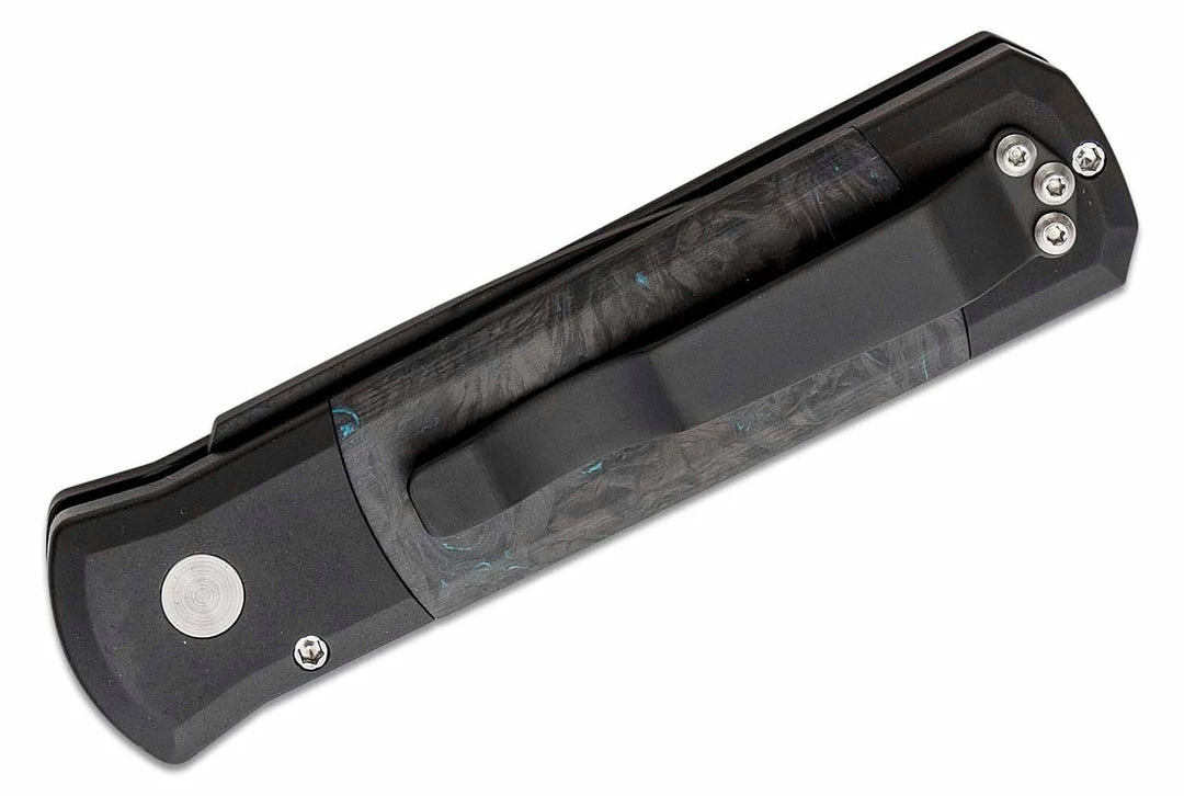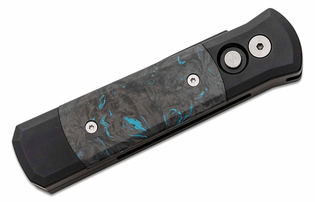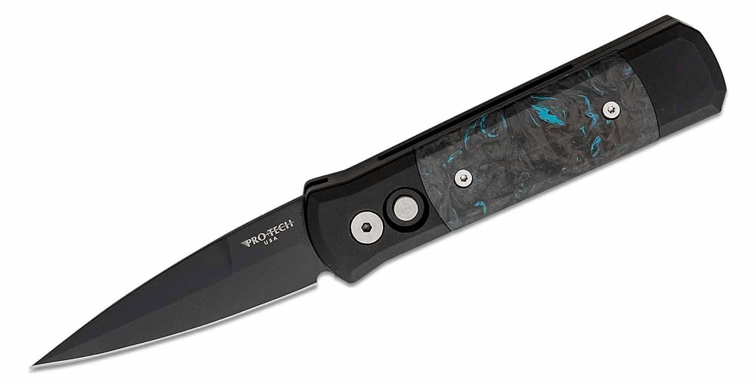 Pro-Tech Knives is proud to be the first choice of Police and Military professionals around the world. Pro-Tech Knives are built to serve and serve well. This is the highly anticipated 3.15″ blade version of the popular Godfather AUTO knife. Italian Inspiration and American Innovation have created another superior coil spring action auto knife. Like the original 4″ blade Godfather, the Godson is available in a wide variety of styles and materials. This model features a black anodized handle with Blue Dark Matter Fat Carbon inlays and a black DLC finished blade. No matter which Godson variation you choose, you will enjoy its combination of unequaled style and quality.