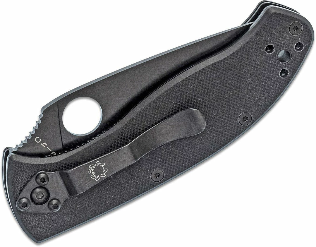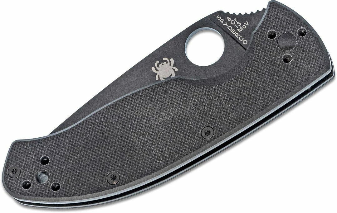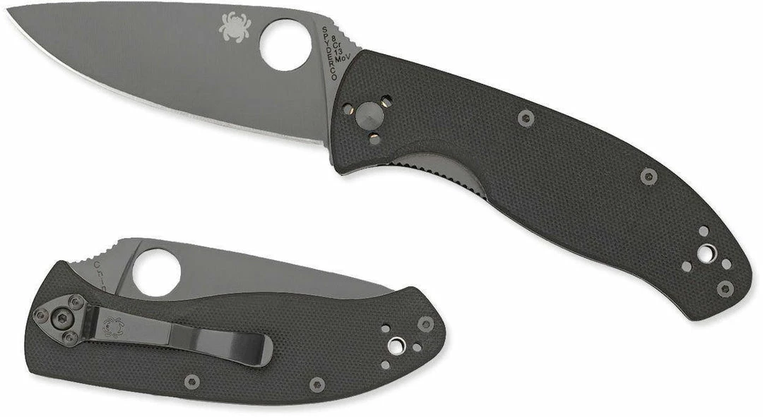 Being tenacious means one holds fast. One is persistent and cohesive. It means being tough and tireless until achieving your goal: all knife-worthy definitions for a worthy knife. The mid-sized Tenacious has a black G-10 laminate handle, milled with prolonged fatigue-free cutting in mind. Tucked inside are skeletonized steel liners increasing the handleβs rigidity and strength without adding non-functioning weight or bulky thickness. The 8Cr13Mov stainless blade is leaf-shaped and ground flat from spine to cutting edge for cutting performance. The bladeβs shape coupled with an oversized Spyderco Round Hole and textured spine jimping allow you to open the blade and position your thumb on the spine in slip-proof confidence ready for work. A Walker Linerlock (with jimped liner) and a 4-way pocket clip lets you set your carry and draw preference: Tip-up/tip-down left-hand/right-hand. Screw together construction.