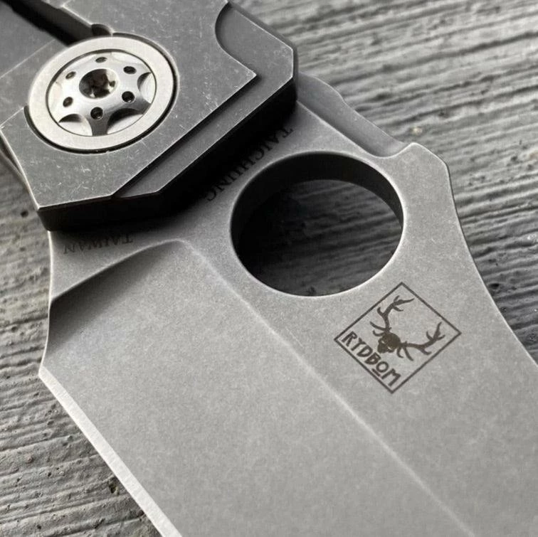 Inspired by custom knifemaker David Rydbomβs βBill the Butcherβ design, the Stovepipe blends dramatic style with serious performance. Its stout cleaver-shaped blade is crafted from 4mm (.157-inch) thick CPM 20CV stainless steel and has a deep hollow grind for superior edge geometry. The handle is constructed from two slabs of solid titanium joined by a titanium back spacer. Both scales are painstakingly machined to create beautifully crowned outer surfaces and the reverse-side scale forms the foundation of the knifeβs Reeve Integral Lock (R.I.L.) mechanism. The oversized pivot pin is machined with artistic accents and serves double duty as an over travel stop for the lock bar. To allow convenient carry, the Stovepipe includes a machined titanium clip configured for right-side, tip-up carry. The clip, scales, back spacer, and blade all feature a no-nonsense, industrial-style stonewashed finish.