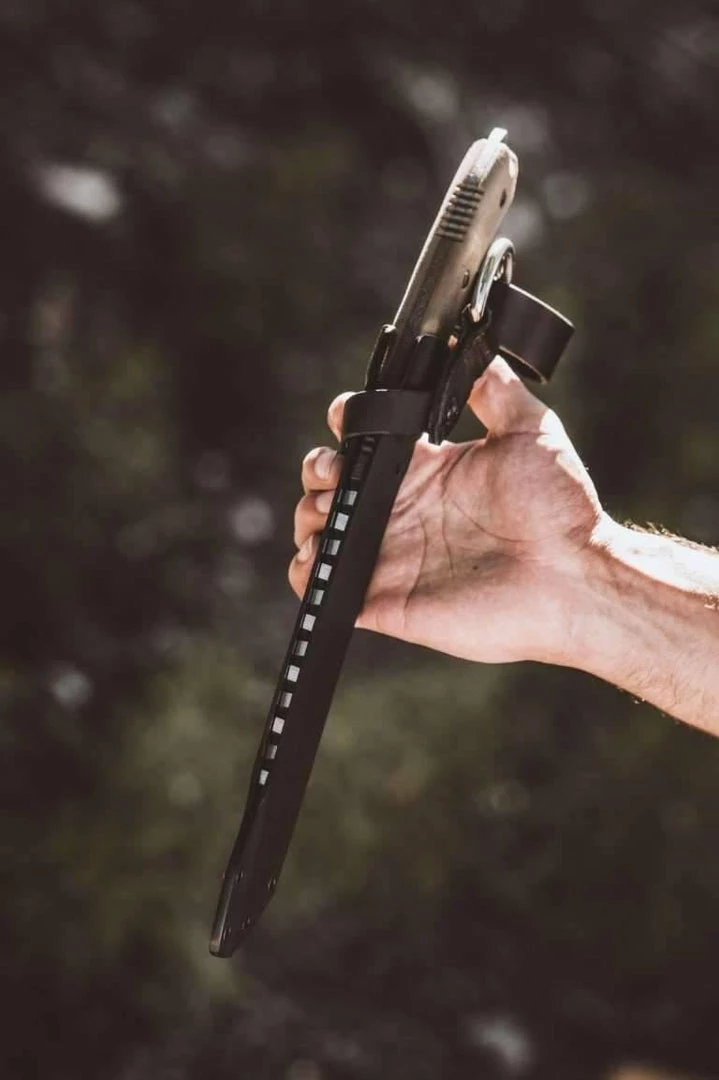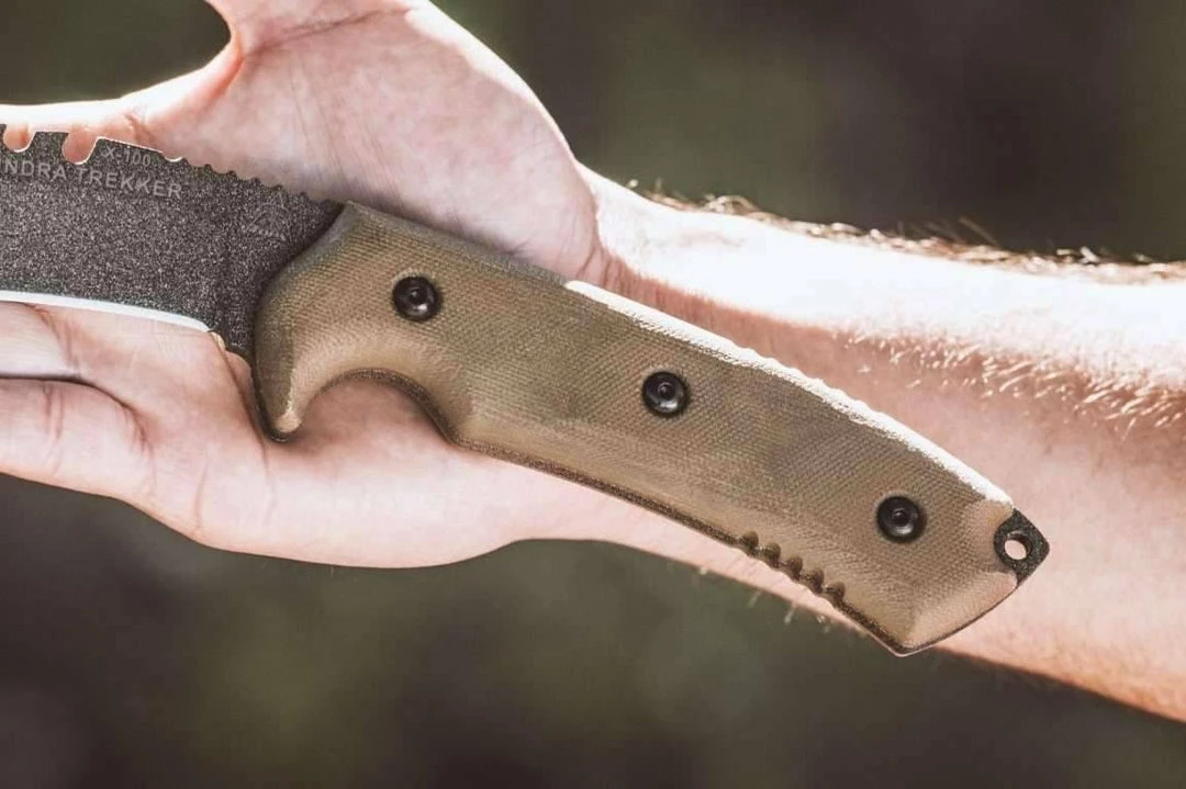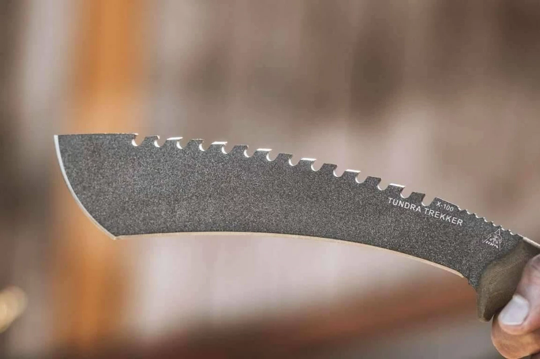 The Tundra Trekker is a Kukri-esque design that has the blade heavy balance and generalย shape of aย standard kukri with TOPS unique style. It has a robust powder coat finish, comfortable handles, opposingย pitch saw teeth, and a forward curved blade all designed to excel in several uses. Anything fromย chopping wood, to making traps and tent pegs, clearing brush, and whatever else you might decide toย throw its way. The open backed Kydex sheath comes equipped with a dangler to make it easy to carryย through thick brush and trees. This is a great option for those looking for something in the 9โย bladeย range.