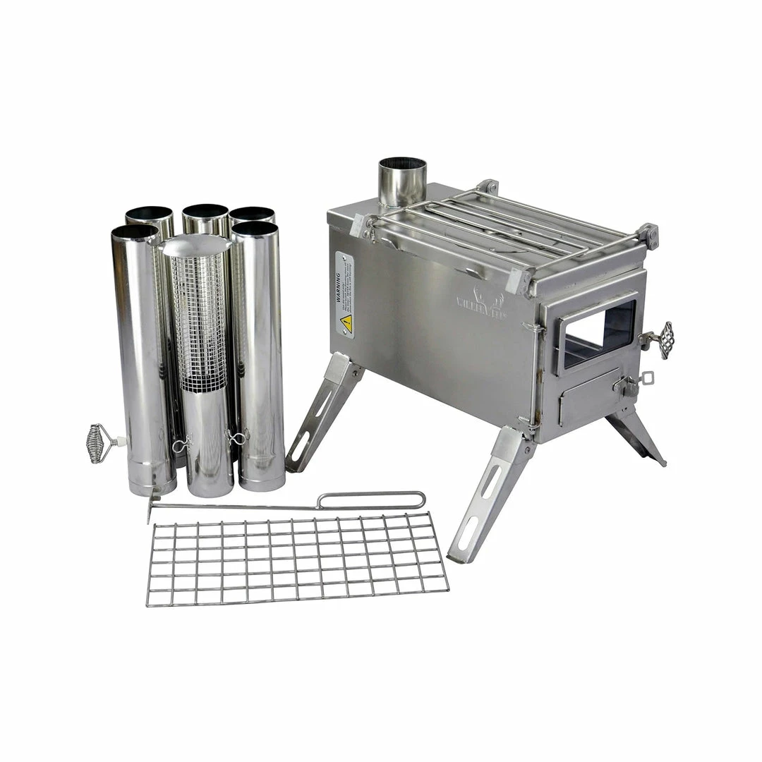 - Highly portable- Nesting legs and shelves fold flat to the stove body; 5 pipe sections, spark arrestor, and an ash scraper stow inside the stove body